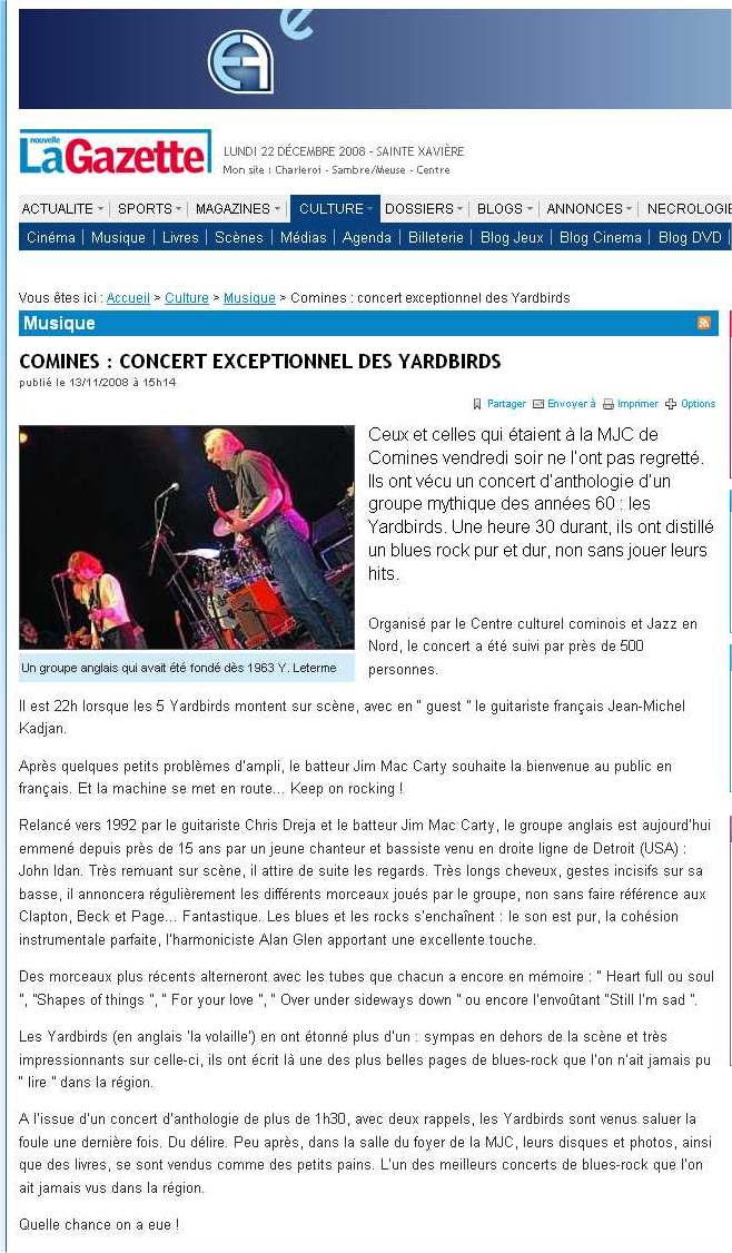 La tournée de l'automne 2008 fut sans doute un grand évènement pour tous les fans. Grâce au travail de toute l'équipe de André Soulies, la tournée s'est effectué sous les meilleurs auspices. Les médias ont participé de manière active à sa promotion, radio, télévision, presse, tous ont remarqué qu'un groupe légendaire venait rendre visite à la vieille France. On pourrait presque ajouter avec une ironie sans méchanceté, qu'ils ont enfin découvert que certaines légendes des sixties existent encore. Bien sûr ce n'est pas l'audimat de la Star Academy qui est menacé, mais c'est toute la différence entre des bulles de savon qui interprètent les chansons des autres et d'autentiques artistes qui sont entrés dans l'histoire grâce à l'originalité de leur créations. Forts de cette carte de visite qu'ils n'ont en fait pas besoin de présenter, les Yardbirds sont venus secouer la grisaille du brouillard automnal.